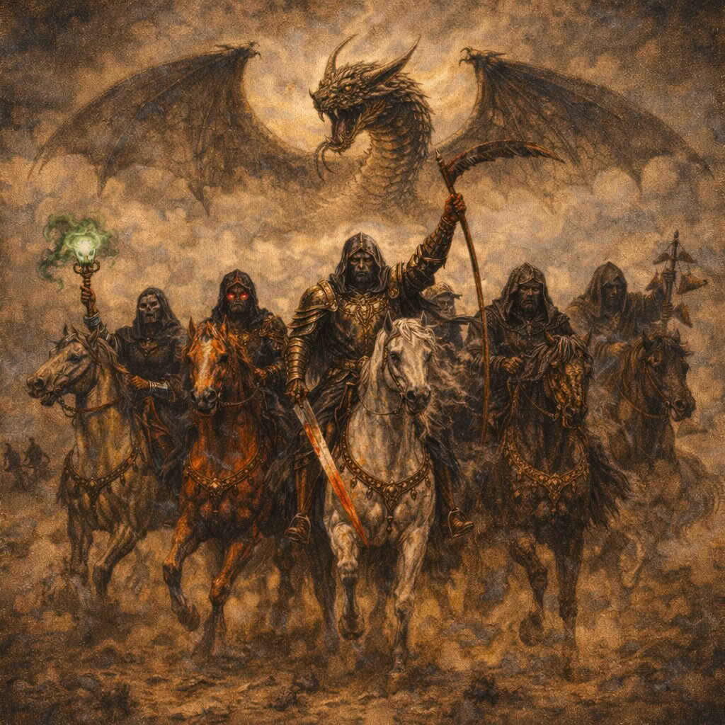 Jeźdźcy Apokalipsy – fanatyczna grupa pustynnych jeźdźców praktykujących okultystyczne rytuały, by zyskać nadprzyrodzone moce. Swoją ideologię wywodzą z wierzeń w skrzydlatego węża, którego nazwali Thueban. Swoją aktywność w Albaryi i Królestwie Erellanu zainicjowali dwukrotnie. Za pierwszym razem pod koniec IX wieku erellańskiego za czasu panowania króla Maykara, a później w latach 20-tych X wieku.